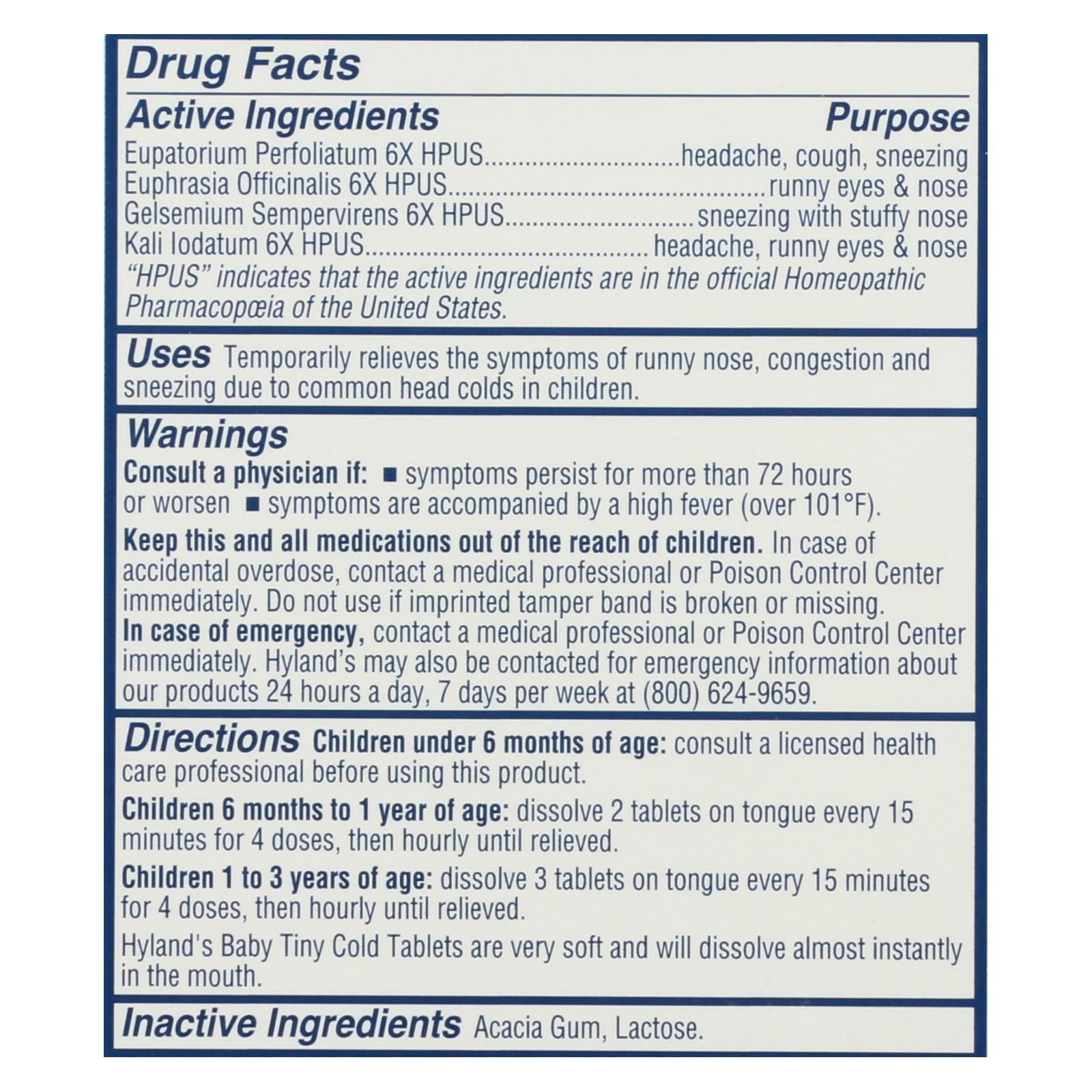 Hyland's baby tiny cold tablets are made from homeopathic ingredients such as kali iodatum and gelsemium sempervirens to promote natural relief for runny noses, sneezing and congestion due to colds. Designed for kids ages 6 months to 3 years, this remedy is free of parabens, artificial flavors and dyes. Give your child two to three tablets every 15 minutes for the first four doses, then repeat hourly until symptoms are relieved. This bottle contains 125 quick-dissolving tablets.